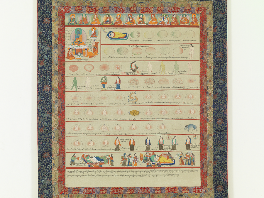 顶排十二尊佛像为赞普赤松德赞等《四部医典》的传承图。