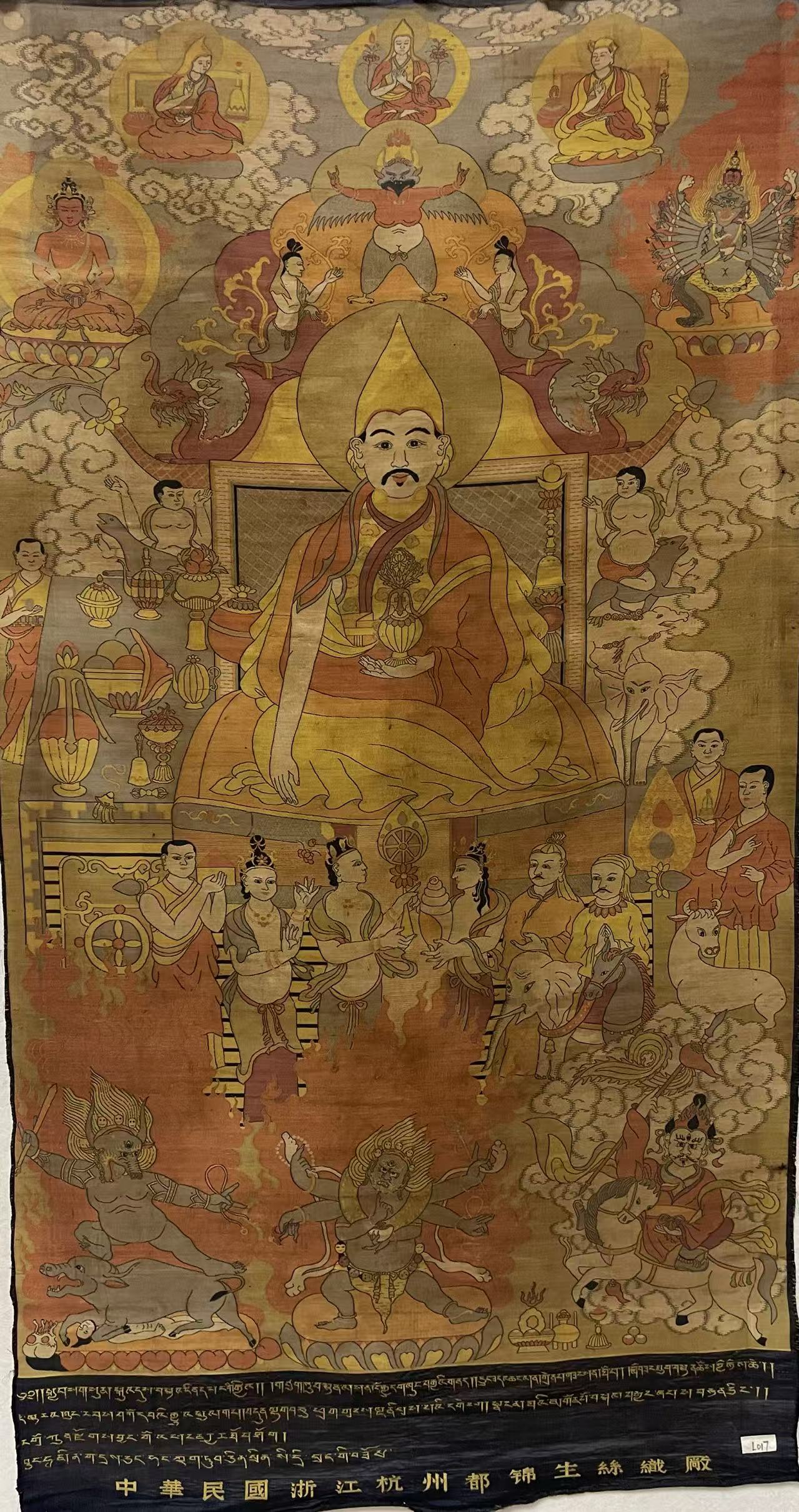 第二行题记(汉藏)为:ལྕང་ཧྭ་མིན་ག་[ཀྲུང་ཧྭ་མིན་གོ][ 注:“ལྕང་ཧྭ་མིན་ག”是唐卡上的原题记,[ཀྲུང་ཧྭ་མིན་གོ]是后加的标注。]དྲས་ཅང་ཧང་ཀྲག་ཏུབ་ཅིན་སྲིན་སི་དྲི་པྲང་གི་བཟོས་中華民國浙江杭州都錦生絲織厰。