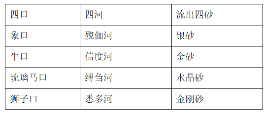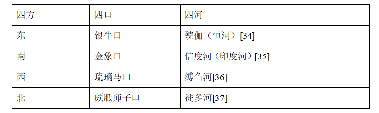 通过《长阿含经》与《俱舍论》系统的对比,可以看出四方所流出的四河是一致的,但是信度河和悉多河所流出的出口之名有出入。然而,“四方”、“四口”、“四河”与今天西藏阿里著名的四条河流[39]也并不完全吻合。