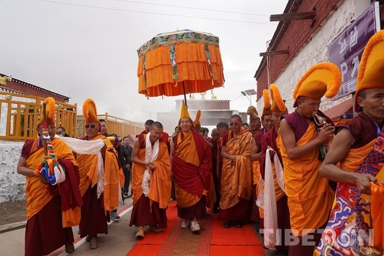 班禅抵达扎果寺后由手持香炉和吹唢呐的僧人引路,手持黄伞的高僧护送至主殿朝拜。随后,班禅登上主殿宝座带领僧众诵经祈福,并向僧众传授宗喀巴大师《缘起礼赞》,僧人代表向班禅敬献曼扎,班禅为僧众摸顶赐福并发放布施。