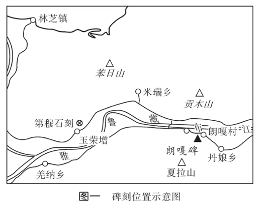 朗嘎石碑东距第穆萨石刻几公里处(见示意图),具体位于林芝米林县丹娘,雅鲁藏布江南岸的朗嘎南部的山坡上,是吐蕃赤松德赞在位时期(755—797)的勒石资料,主要内容是吐蕃与工布噶波王结盟册封的情况。朗嘎石碑所记内容比第穆萨石刻早,其反映历史在第穆萨石刻中记为“赞普天王子墀松德赞之际,诏与噶波小王盟书”,这说明在第穆萨石碑之前,吐蕃与工布曾经有过盟誓之举,并刻石为证。