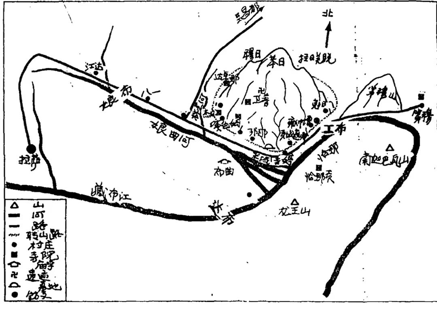 这段传说与真实杂糅的故事,可能反映了从止贡赞普之后西藏高原开始出现陵墓的历史事实。与考古发现的山南琼结藏王墓存在相比,止贡墓只是根据杂糅传说与真实的记录所判断的一个遗址大致所在,尽管如此,它揭示了早期吐蕃墓葬制度的变迁和历史记忆在当地人中间的流传。拉日江多寺堪布西绕得知我们一行的目的后,为我们当向导,领我们到了传说中的止贡赞普墓——苯日山附近的工域哲那一带实地考察,并指明止贡墓的具体位置——一个在高处的颇有历史感的封土堆。在堪布指引的地点,这里确实处处都留有止贡的影子。苯教文献《苯日山志》也记叙了在藏布和娘曲河附近发现了止贡赞普的遗体,并在工域哲那举行了葬礼。看来,止贡赞普葬在苯日山腰的工域哲那一带已经在当地深入人心。
