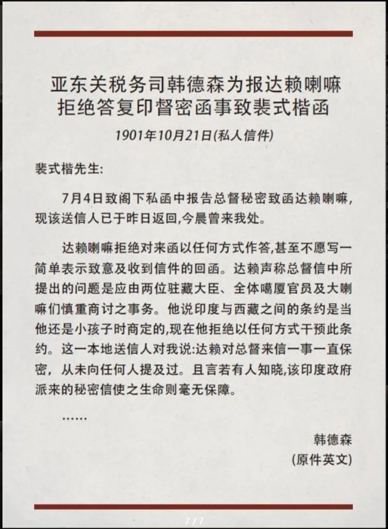 这两次拒绝信反映了十三世达赖喇嘛在英国第一次武装入侵西藏地方之后一直保持的坚定态度,就是反对英国入侵西藏和介入中国西藏地方事务。同时,达赖喇嘛又对接受来自英印政府的信函保持戒备心理,按照清廷的规定,西藏地方政教首领不可擅自与外国直接通讯往来,尽管清朝已走向衰落,甚至还屈服于英国的压力,不断让西藏地方开放门户接受外国人来藏游历的要求。