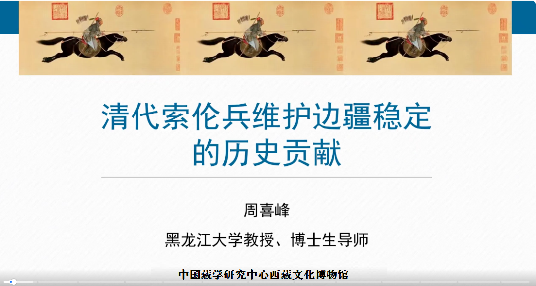 为深入贯彻习近平总书记关于铸牢中华民族共同体意识、加强边疆治理的重要论述,2025年7月22日,中国藏学研究中心西藏文化博物馆第32期西藏文化讲坛特邀黑龙江大学及黑河学院周喜峰教授,作题为“清代索伦兵维护边疆稳定的历史贡献”的学术讲座。本次讲座采取线上直播形式,吸引近500余人参与,反响热烈。